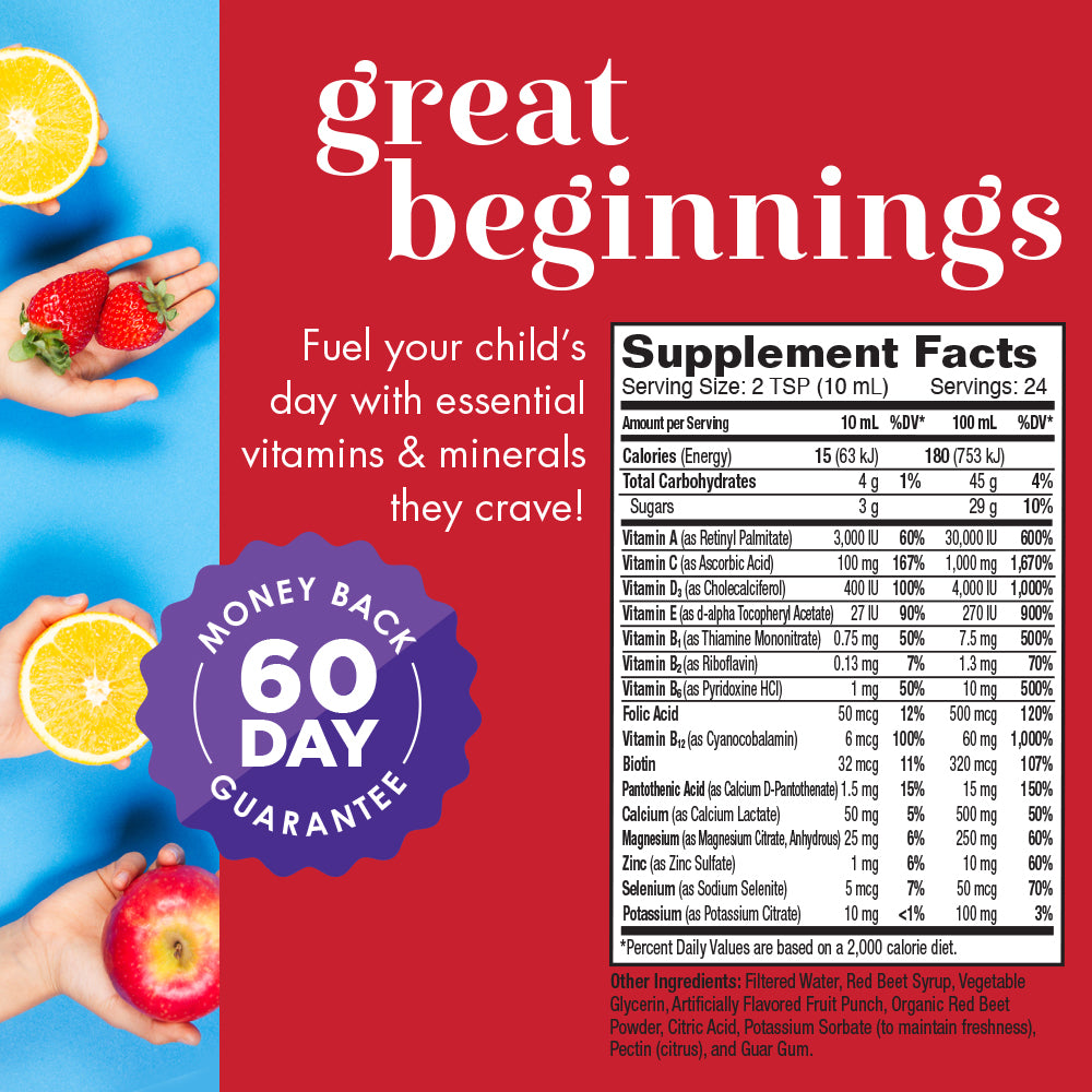 Dynamic Health Liquid Multivitamin with Minerals for Children is making a big splash for all of the right reasons! With a delicious Fruit Punch taste that kids love, this liquid multivitamin delivers essential vitamins and minerals in a readily absorbable liquid formula that is highly potent yet gentle on the stomach. Dynamic Health Liquid Multivitamin with Minerals is sure to add a delicious flair to your childs morning as well as health support to everyday life.