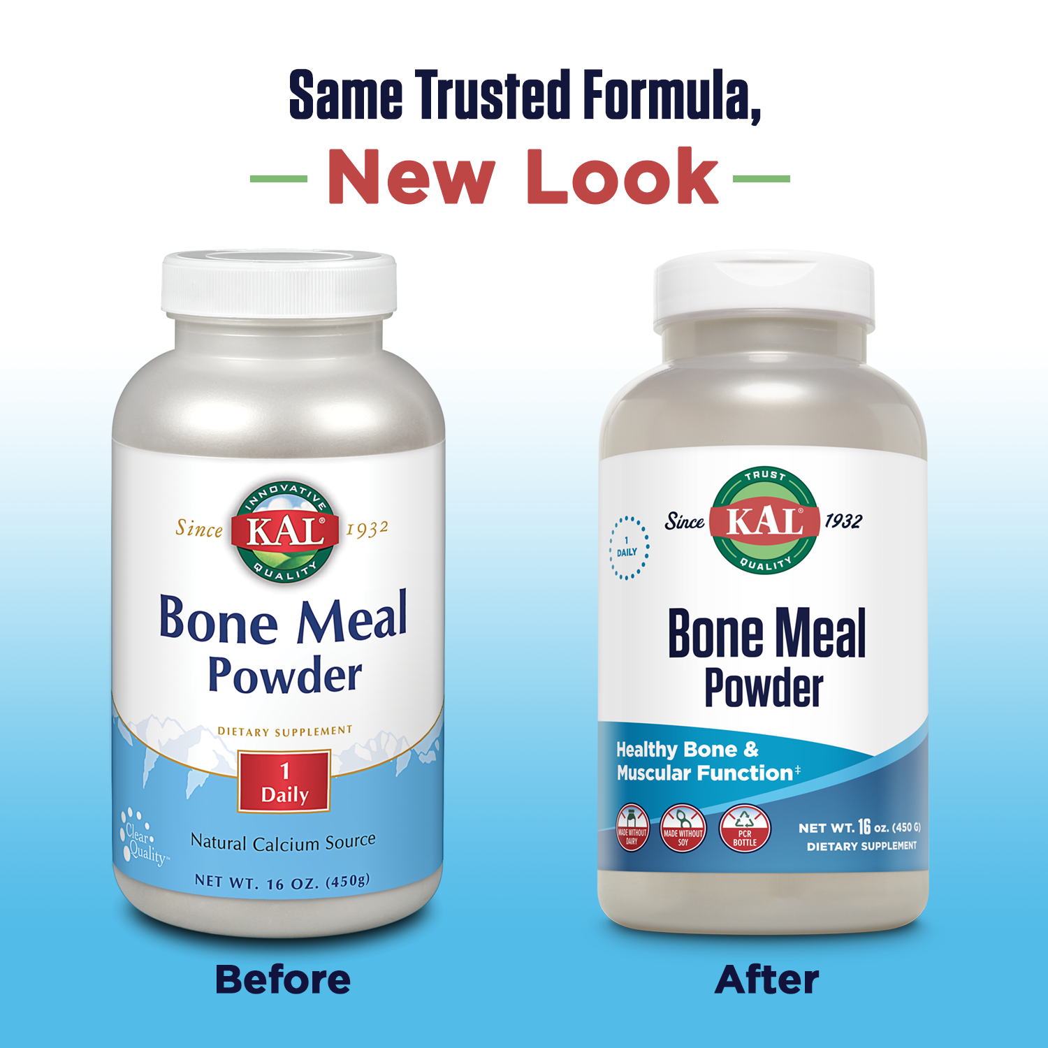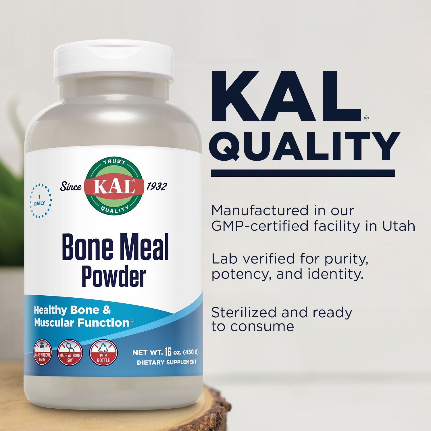 A whole food rich in nutrients, KAL Bone Meal Powder provides 1300 mg Calcium â 100% the DV of this important mineral â as well as 440 mg Phosphorus and 15 mg Magnesium per serving. Bone Meal is intended to provide synergistic support for strong bones and teeth, proper muscle function, nerve health and more. Sterilized and completely edible, our food grade Bone Meal is very finely ground and virtually tasteless. Supplement your diet by adding it to your favorite protein drinks, juices or yogurt, or blend it into hot cereals, baked goods, casseroles and other recipes. Bone Meal Powder is made without soy or dairy, and like all KAL products, is lab verified for the purity and potency of its ingredients. Confidence in the KAL name is just one of the reasons weâve been around so long and maintain our place as a leader in the industry. Unlike many other companies, we manufacture almost all our own products in our GMP-certified facility in Utah and thoroughly test and screen raw ingredients for contaminants and impurities. Managing the production process from start to finish allows us to provide the best possible quality. Rest assured, only the purest formulas ever reach your cabinet. Trust KAL to deliver the highest quality Bone Meal Powder for strong bones, muscle health and more. Also look for: harina de huesos, colÃgeno, carbonato de calcio, suplemento, magnesio.