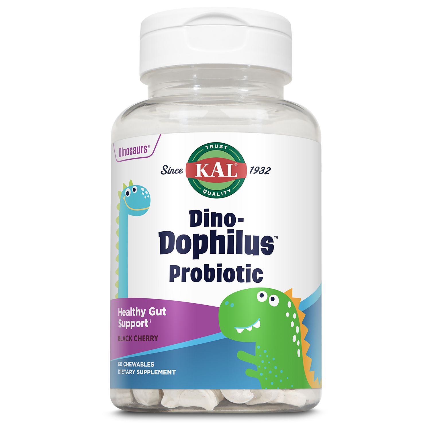 KAL DinoDophilus Probiotics for Kids, Kids Probiotic with 2 Billion CFU, Chewable Kids Probiotics with Natural Black Cherry Flavor for Gut Health and Digestion Support, 60 Servings, 60 Chewables