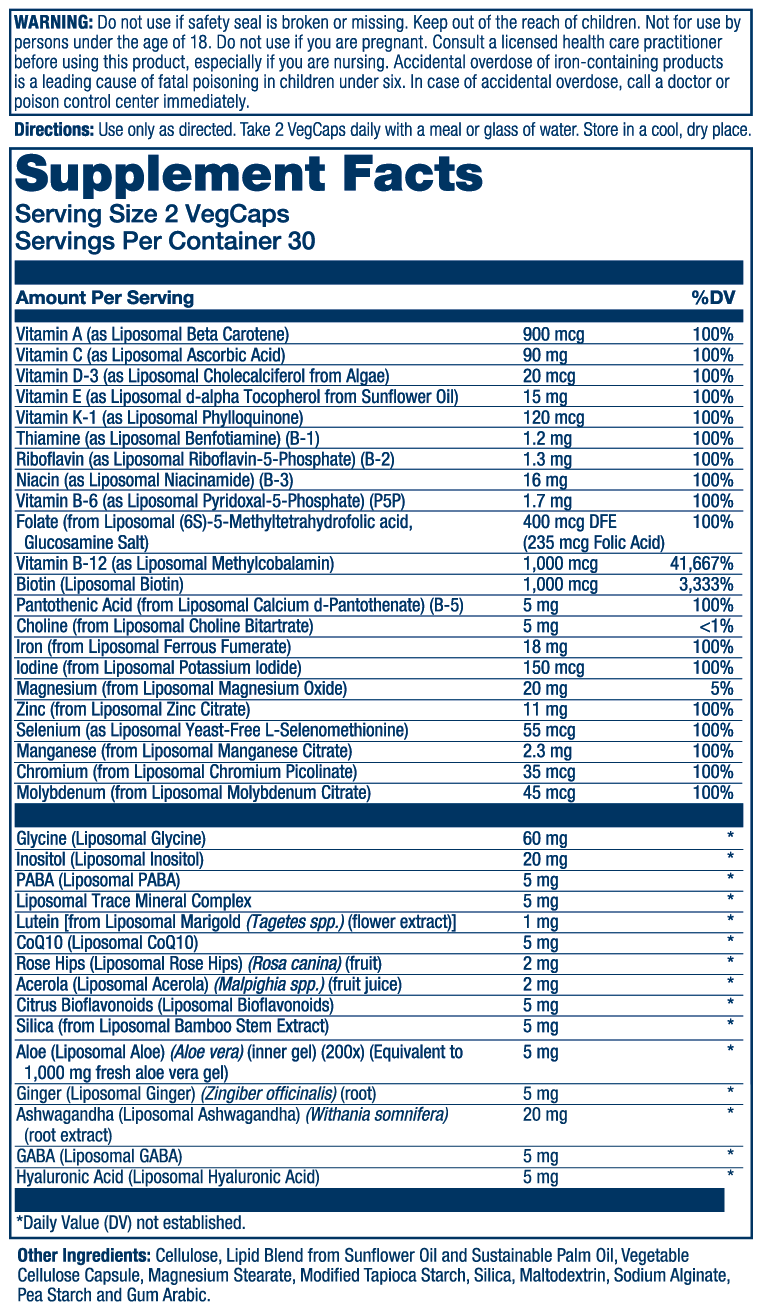 - A high-potency blend of 37 liposomal nutrients—with 19 vitamins and minerals at 100% of the Daily Value or more