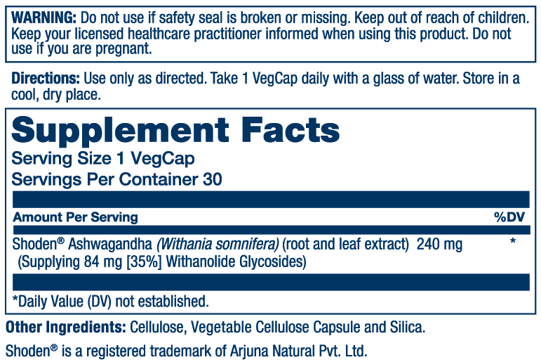 - With 240 mg clinically studied Shoden® Ashwagandha supplying 84 mg (35%) withanolide glycosides, the herb’s beneficial compounds