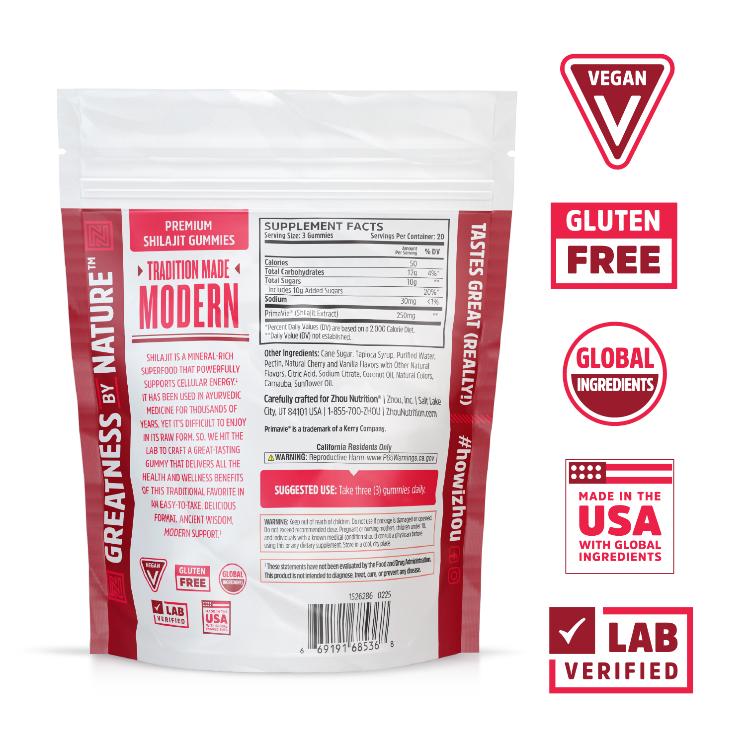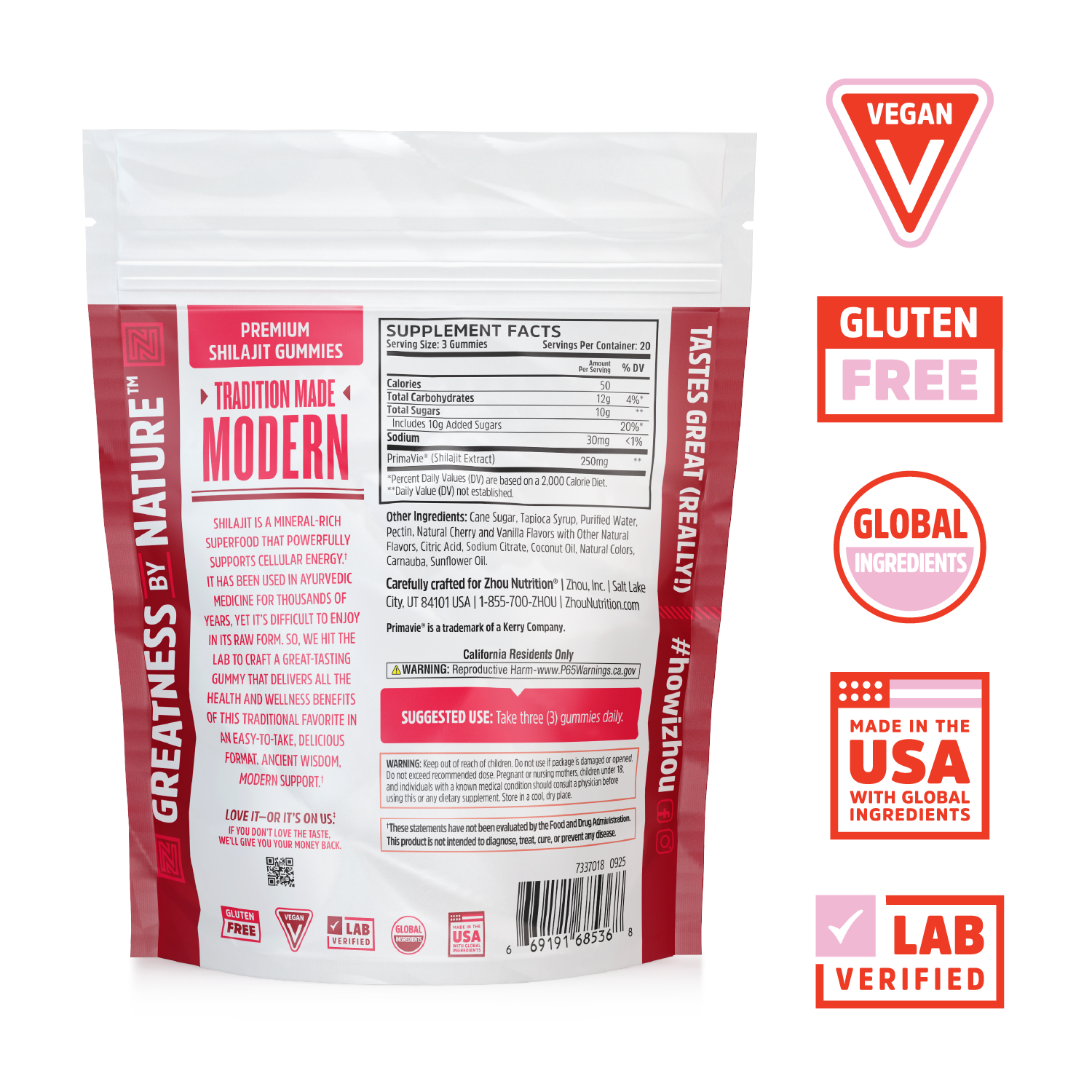 Ancient wisdom. Modern support. Our Shilajit Gummies are made with the same mineral-rich substance sourced from Asia’s high-altitude Himalayan mountain ranges—a substance deeply rooted in centuries-old Ayurvedic traditions. We’ve transformed it into a great-tasting gummy using clinically studied Primavie® Shilajit, known for its proven efficacy and support for cellular energy*—in a delicious, easy-to-take gummy that’ll brighten your day.