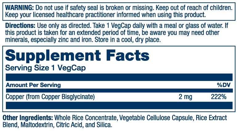 - Delivers 2 mg copper bisglycinate, an essential trace mineral, to support daily functioning*