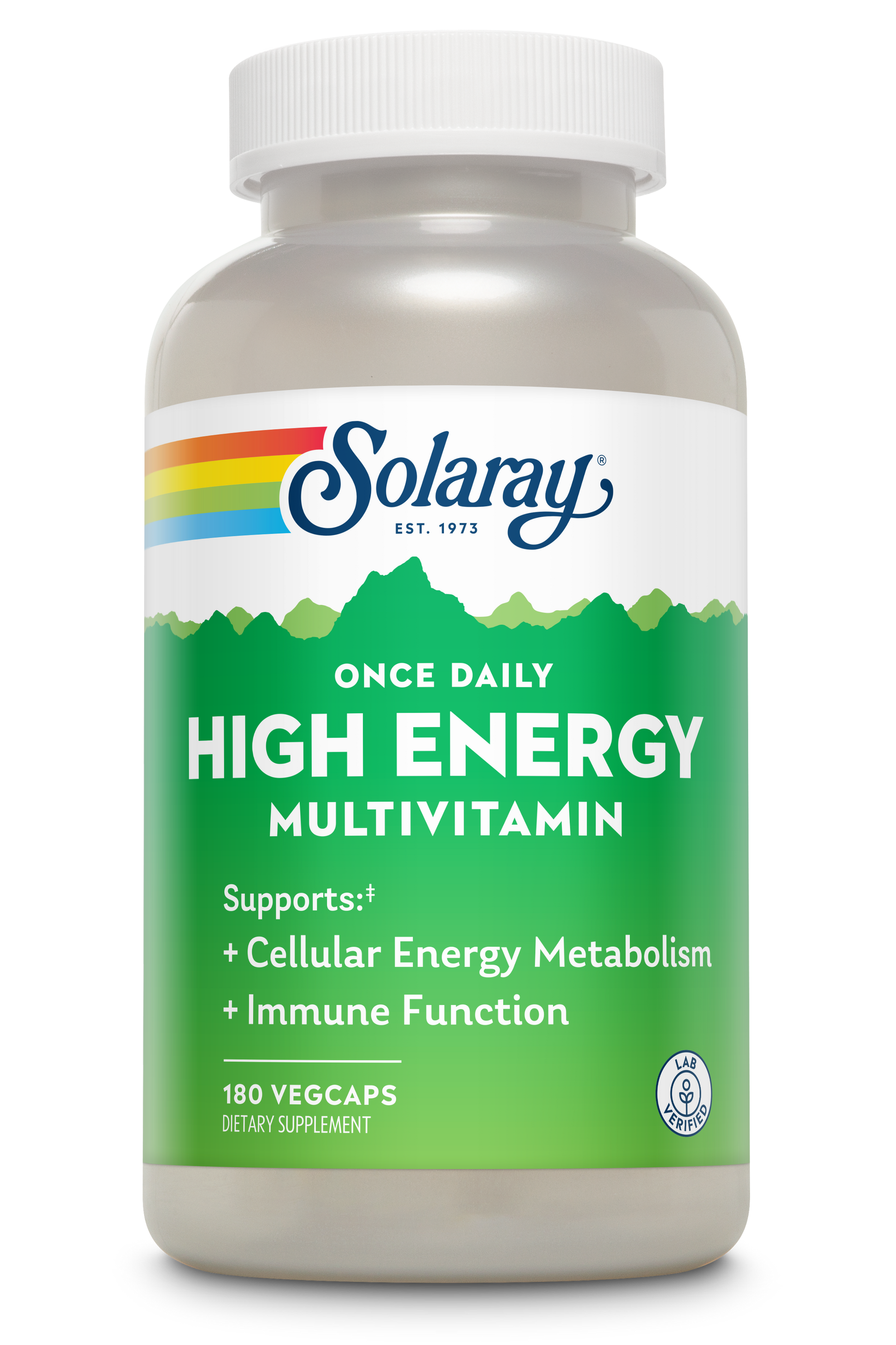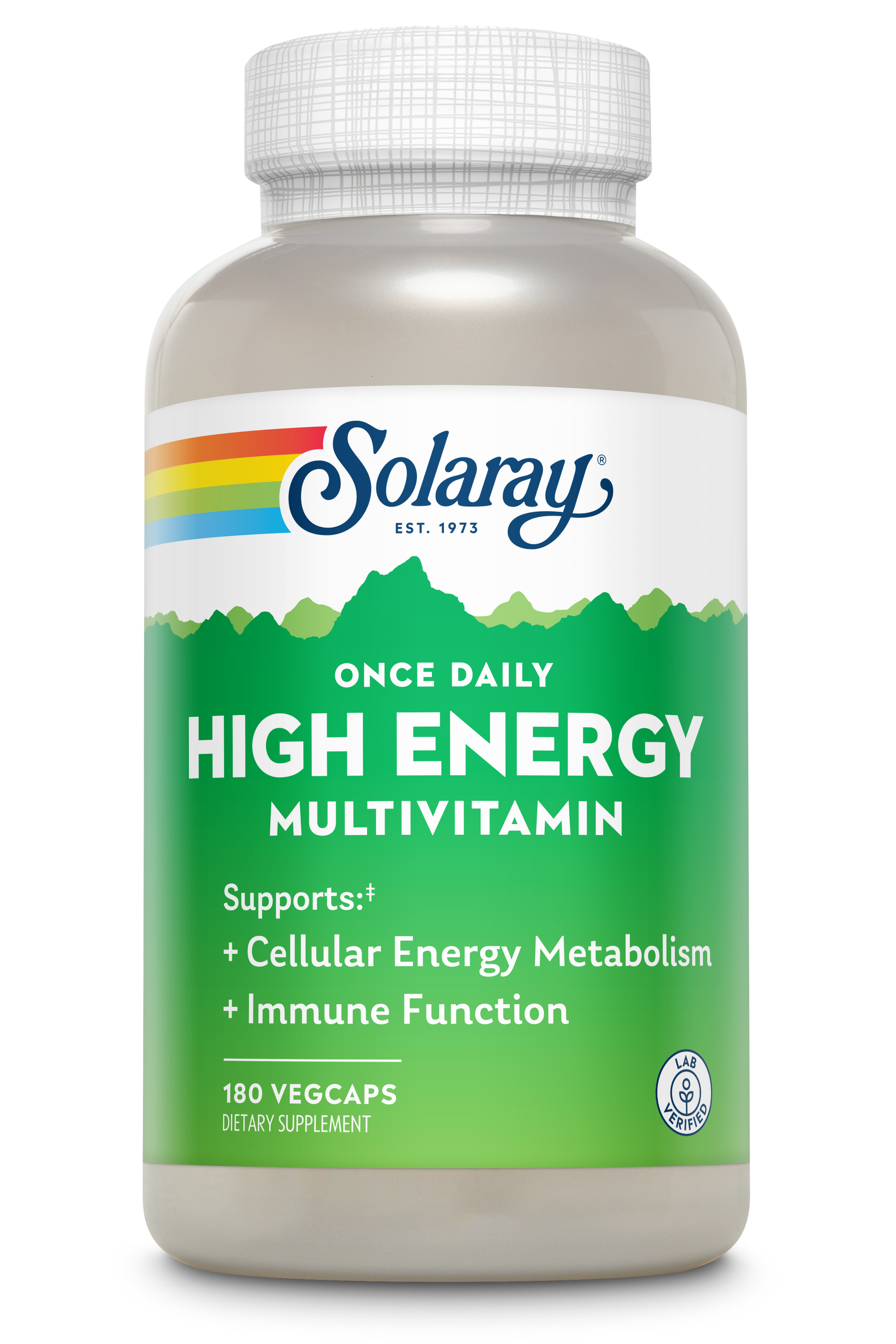Supercharge your wellness: Solaray High Energy Multivitamin is formulated to maximize your health with vitamin B1 to support cellular energy metabolism, vitamin A for immune function support, and a whole food and herb base to help power up your day.*