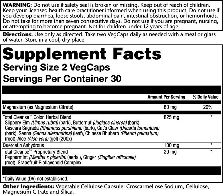 - Provides 825 mg Total Cleanse™ Colon Herbal Blend featuring slippery elm bark, butternut bark, cat’s claw bark, Chinese rhubarb root + more