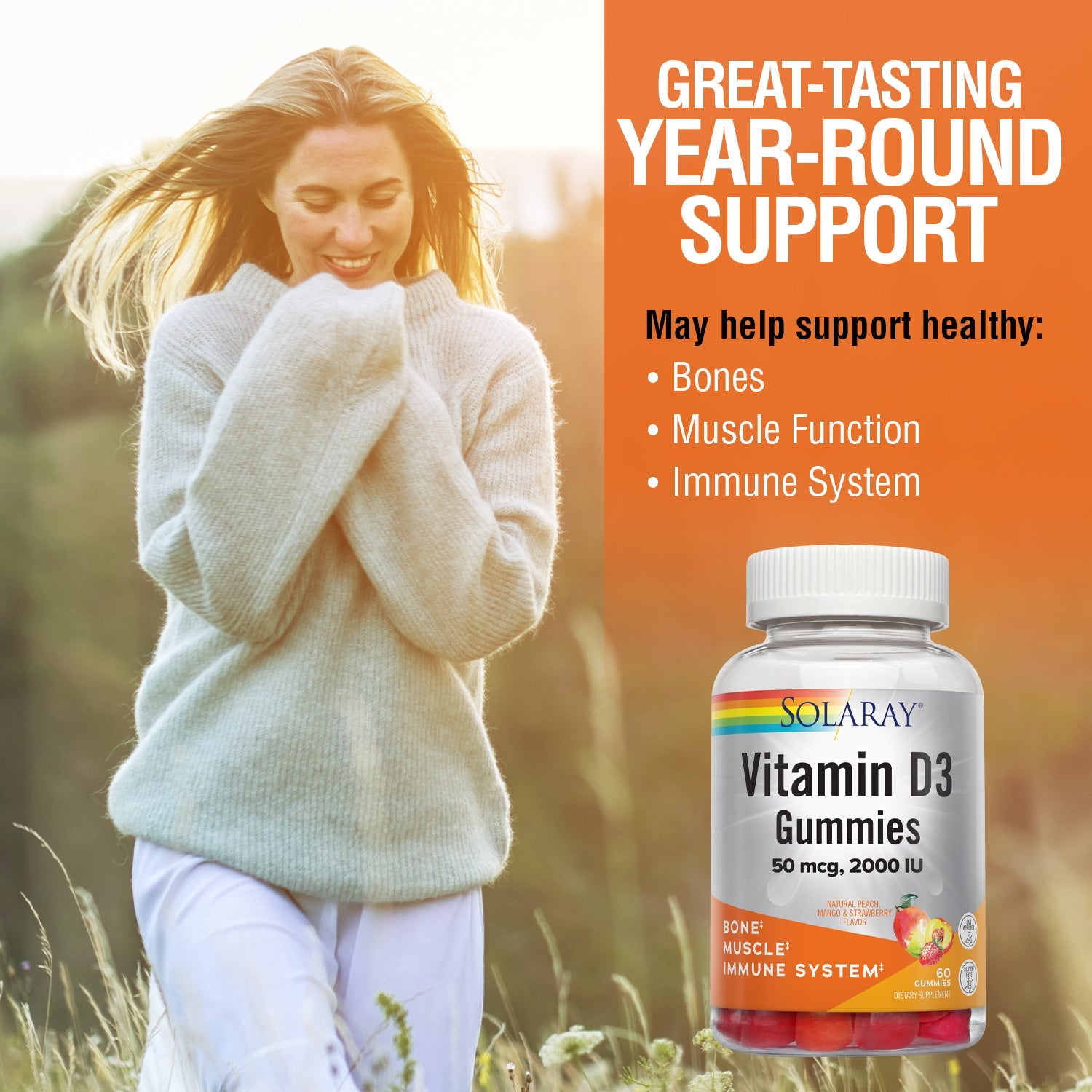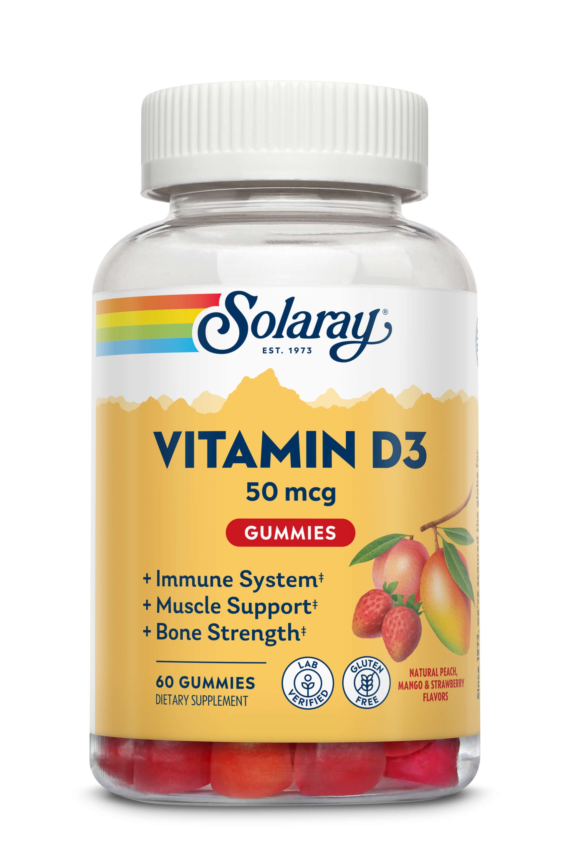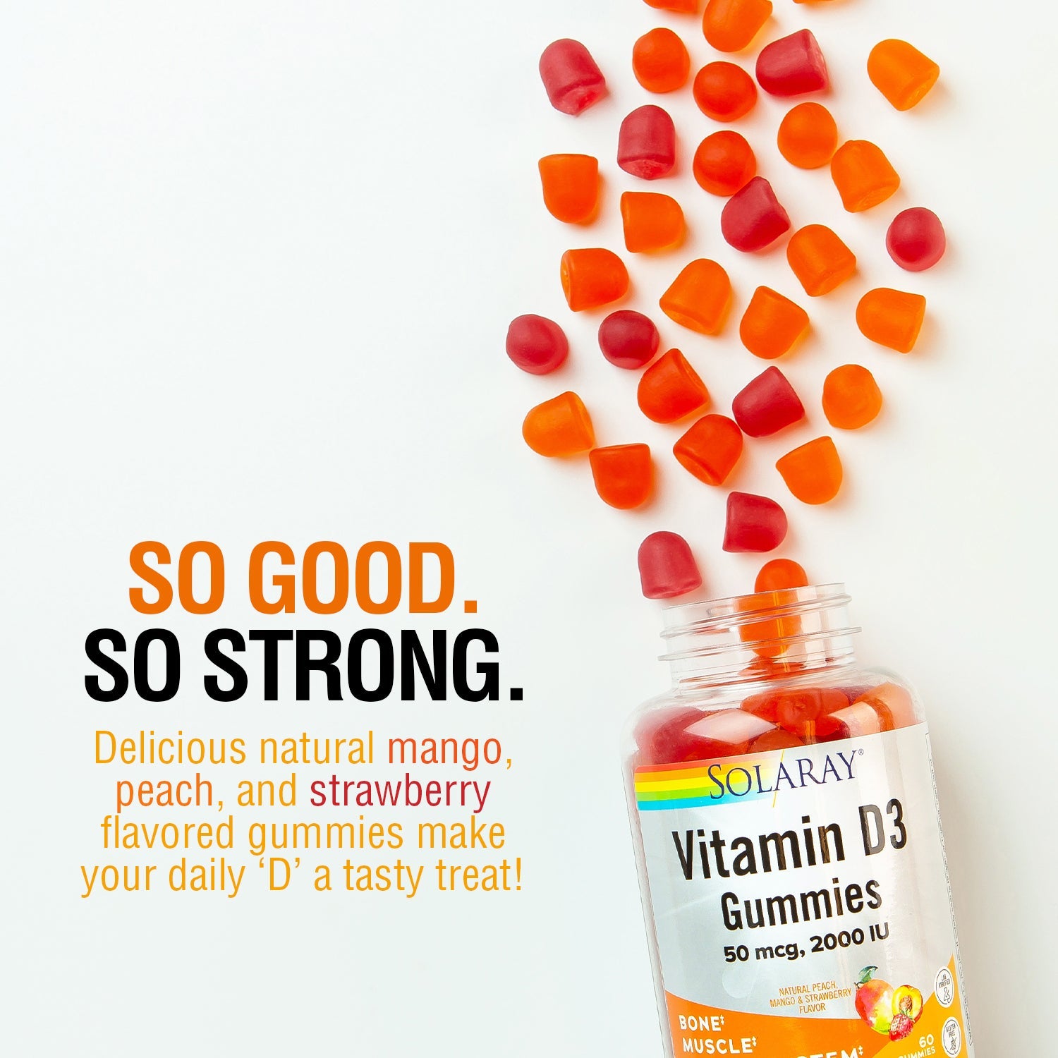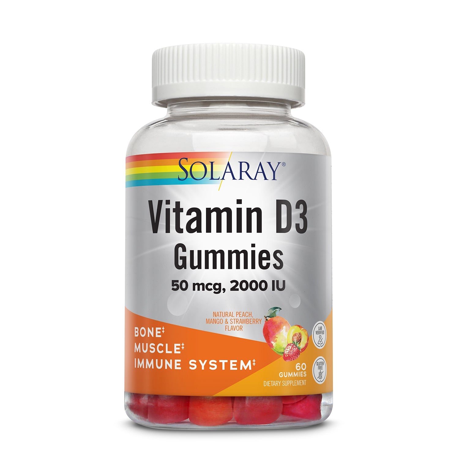 Formulated with 50 mcg (2000IU or 250% DV) of vitamin D in every 2-gummy serving, Solaray Vitamin D Gummies are a tasty way to help support healthy bones, muscle, and immune system function. Perfect for both the long winter months spent indoors and the warm summer days covered in sunscreen, our gummies are expertly designed to provide the same form of vitamin D naturally formed in your body through sun exposure. No need to swallow pills à our delicious natural peach, mango, and strawberry flavored gummies make taking your daily ÃDà a tasty treat! And made without gluten or gelatin, our vitamin D gummies ensure you get a quality supplement you can feel good about!