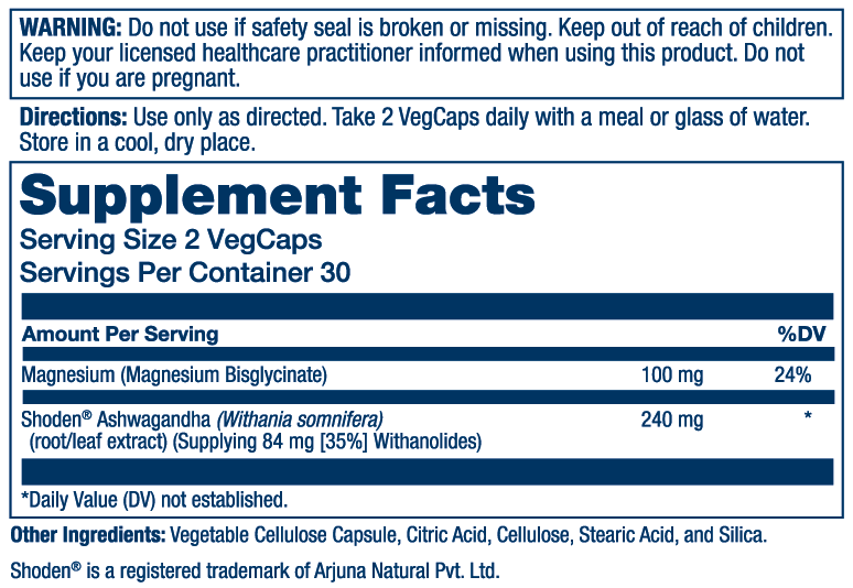 - Features 240 mg ShodenⓇ††† ashwagandha clinically studied to support relaxation, calm, mood, occasional stress, sleep, and provide adrenal support to help regulate the body’s stress response system*