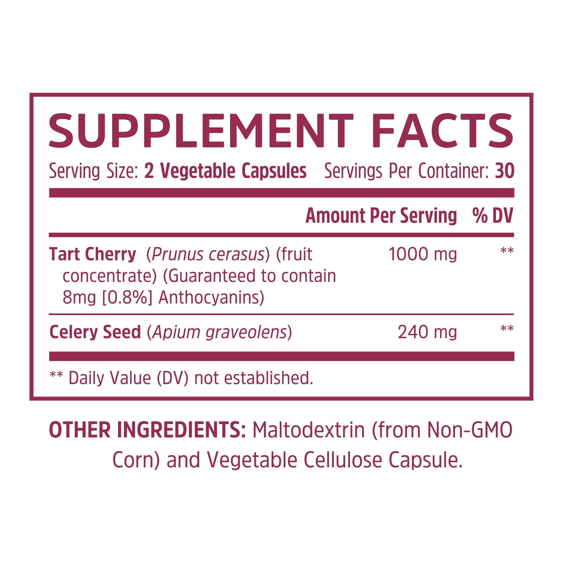 Some foods can raise uric acid levels, leaving you feeling restless and off your game. Zhou Tart Cherry Extract with Celery Seed is formulated to help support muscle recovery and uric acid metabolism, so you can move freely and get back to doing what you love.* It harnesses the juicy benefits of tart cherry in convenient capsules.